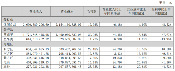 以洽洽为例,2025年中报指出,2024年内蒙葵花籽产区的连续阴雨直接导致原料霉变率升高、合格原料供给减少。同时,全球坚果原料的周期性波动也推高了采购成本。这种成本压力直接侵蚀了产品毛利率,成为影响行业利润水平的普遍因素。